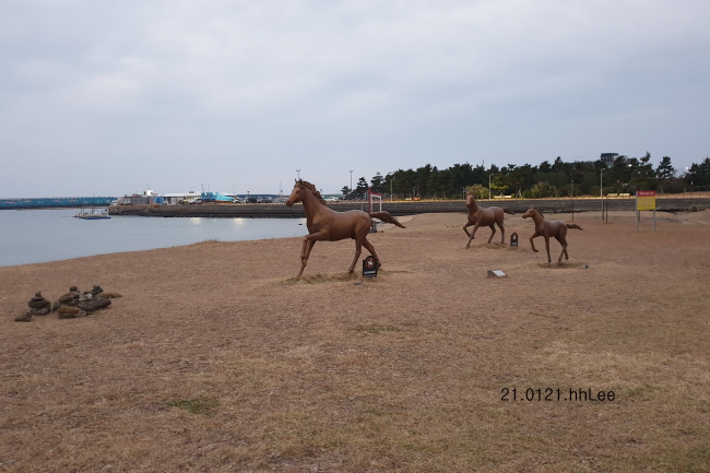 현무암 바위가 없고 방파제와 등대, 운진항이 훤히 보이는 이 위치가 예전의 해수욕장이었을 것이다. 지금은 모래가 거의 보이지 않는다. 대신 두 번째 사진처럼 말 동상 3마리가 커다란 말똥 조형물과 함께 서 있다.