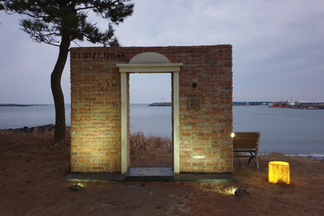 첫번째 사진은 시멘트로 만들었고, 위와 바닥에 조화가 있는 것으로 미루어 사진 촬영 포인트 같다. 두 번째의 벽돌로 만든 사각형 문도 관광객을 위한 사진 촬영 포인트 같다. 문 뒤로 우리가 방금 전에 들른 운진항의 등대와 방파제, 배들이 보인다.