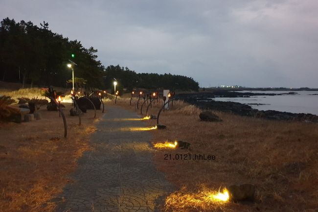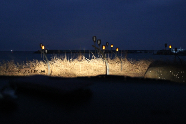 이 방향은 운진항 반대편인데 멀리 보이는 건물과 불빛은 어딘지 헷갈린다. 하모해수욕장은 오목하게 육지쪽으로 들어와 있고, 반도처럼 튀어나온 동남쪽에 알뜨르비행장이 있다. 그 너머에 우리가 가려고 했던 송악산이 있는데 사진 속의 불빛은 알뜨르비행장 부근인 것 같다.