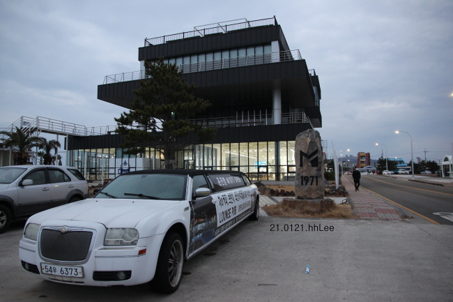 용머리해안을 나서서 20여 분만에 1/21(일)의 마지막 코스인 모슬포 운진항에 도착했다. 원래 송악산으로 갈 예정이었는데 어두워지기 시작해서 모슬포항(실제로는 운진항)으로 바꾼 것이다. 모슬포 운진항 입구(대정읍 하모리)는 예전에 신화단지를 조성할 때 인부들의 거주지였다고 한다. 그래서인지 좁은 지역인데도 단란주점까지 있어서 신기했지만 지금은 코로나 19 때문인지 쥐 죽은 듯 조용했다. 바닷가에 일렬로 형성된 제주도의 다른 곳과 달리 단층집들이 밀집되었지만 회색빛에 벗겨진 페인트, 낮고 작은 건물 등 분위기가 오래된 탄광촌 같았다. 우중중한 날씨와 바닷바람에 의해 페인트나 기와 등이 부식되어서 그렇게 느껴졌는지도 모른다. 글을 쓸 때까지도 운진항을 모슬포항이라고 착각했기 때문에 마라도로 가는 여객선이 보이지 않는 점이 이상했다. 마라도나 모슬포는 아직이지만 모슬포항에서 배를 타고 마라도로 가는 것은 알고 있었기 때문이다. 지도를 첨부하는 과정에서 확인해 보니 내가 모슬포항이라고 생각한 곳은 운진항이고, 모슬포항은 조금 더 위쪽에 있었다. 어쩐지 항구가 너무 작더라니... 항구에는 대부분 한치나 방어를 잡는 어선이 정박해 있고, 쾌속정이 1대 있었으며, 돌핀 투어 안내문도 있었다. 돌핀 투어 동호인들이 모인다는 가장 현대적인 건물 앞에는 장례차 같은 낡은 리무진 1대가 세워져 있었다. 어선들이 있는 바닷가 쪽에서 간단하게 기념 촬영만 하고, 바로 옆에 있는 하모해수욕장에 들렀다.