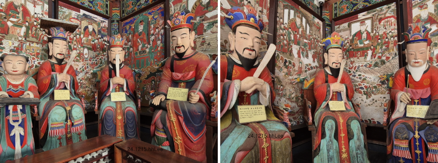 이 참에 시왕(十王)에 대해 살펴보았다. 1왕부터 10왕까지가 왼쪽부터 순서대로 있는 것이 아니라 사진처럼 혼재되어 있다. 윗단 왼쪽은 진광(秦廣1)대왕과 송제(宋帝3)대왕, 오른쪽은 오관(五官4)대왕과 초강(初江2)대왕, 아랫단 왼쪽은 염라(閻羅5)대왕과 태산(泰山7)대왕과 도시(都市9)대왕, 오른쪽은 오도전륜(五道轉輪10)대왕, 평등(平等8)대왕, 변성(變成6)대왕이다.