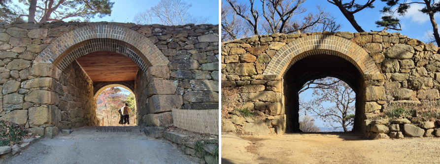 왼쪽은 밖에서, 오른쪽은 안에서 본 모습이다. 안내문에 '동문 방면'이라고 되어있는데 원래는 이 아치형 윗쪽에 건물이 얹혀진 누각 형태였을 것 같다. 삼랑성(三郞城)은 일명 정족산성(鼎足山城)이라고도 하며 단군이 세 아들에게 성을 쌓게 하고 이름을 삼랑성이라고 했다는 기록이 「고려사」에 남아있다. 조선 고종 3년(1866) 병인양요 때 프랑스 군 160여 명이 동문과 남문으로 공격해 오자 양헌수 장군이 이끄는 군대가 물리쳤다.