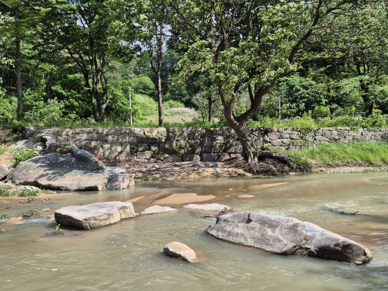 물빛이 투명하지 않고 석회를 푼 것처럼 뿌연 것이 인상적이었는데 이곳만 그런 것이 아니라 석천계곡의 물도 그랬다. 사진의 석축 윗길로 주욱 가다가 왼쪽의 소나무숲을 끼고 돌면 석천계곡과 석천정사가 있다.