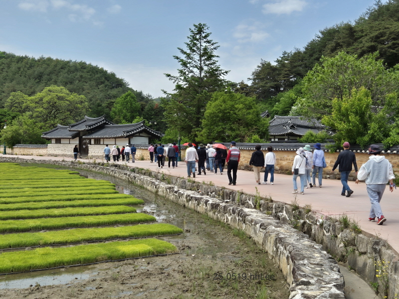 시기가 맞아서 아주 오랜만에 못자리를 실컷 보았다! 연두색 벼싹과 하얀 이팝나무꽃이 어우러져 아름답다! 아래 사진은 우리의 일행인 국립민속박물관 답사팀이 막 권벌 종택 앞을 지나는 중이다.