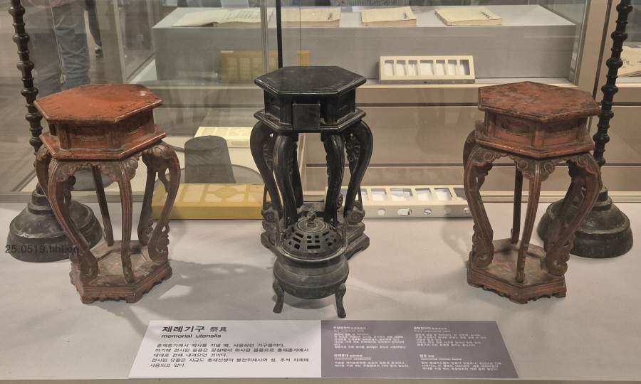유제촛대(좌우, 구슬을 엮은 듯한 황동제 촛대로 사진 윗부분이 잘림), 흑칠향좌아(중앙, 향로를 올려 놓는 받침대로 서랍에 향을 넣어둔다.), 좌우의 주칠향좌아(유제촛대 받침대).