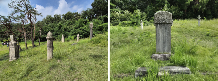 <석실마을 안동김씨(장동김씨) 묘역 아랫단의 묘와 비석들>