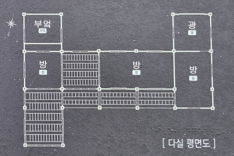 궁집에 있던 가옥 중 맨 앞에 있는 이 집과 초가집 2가 답사에서 제외되었다. 일부러 그런 것은 아니고 둘 다 양쪽 끝에 있다보니 시간에 쫓겨 누락된 것이다. 처음에는 궁집의 일부라고 생각했다가 사진 정리를 하는 과정에서 안내도를 보고 찾기는 했지만 이에 대한 정보는 없다. 일반 가옥이 아니라 별채로 보이는 이곳은 따로 야자매트길을 따라 들어가는 듯하다.