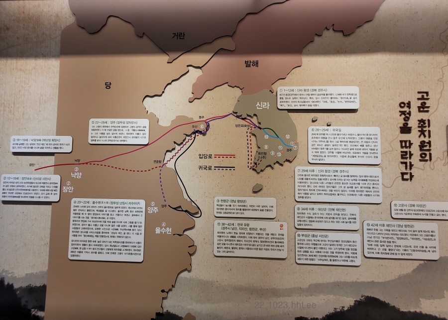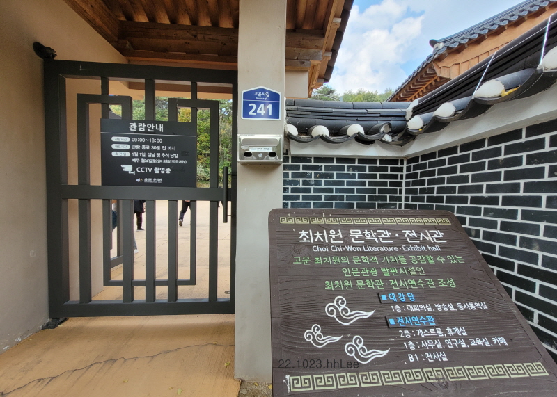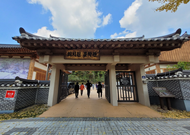 2022. 10.22에 이곳에 들렀고 이곳에만 최치원 관련 전시관이 있는 줄 알았다. 그런데 함양에도 최치원선생 역사공원이 있고, 그 안의 고운기념관에 최치원에 관한 내용을 전시하고 있었다. 함양의 상림은 그가 태수로 재직 시 홍수를 막기 위해 만든 둑을 따라 조성한 숲이다. 정읍의 무성서원에서는 생사당을 보았고, 아주 오래 전에 들린 신안의 비금도인가에서도 최치원에 관한 전설(!)을 들었으니 이 분이 그만큼 대단하다는 의미일 수도 있고, 행동반경이 넓었다는 의미일 수도 있을 것이다. 이 글의 끝부분에 올린 그의 글을 새긴 바위글씨도 전국에 산재해 있다.