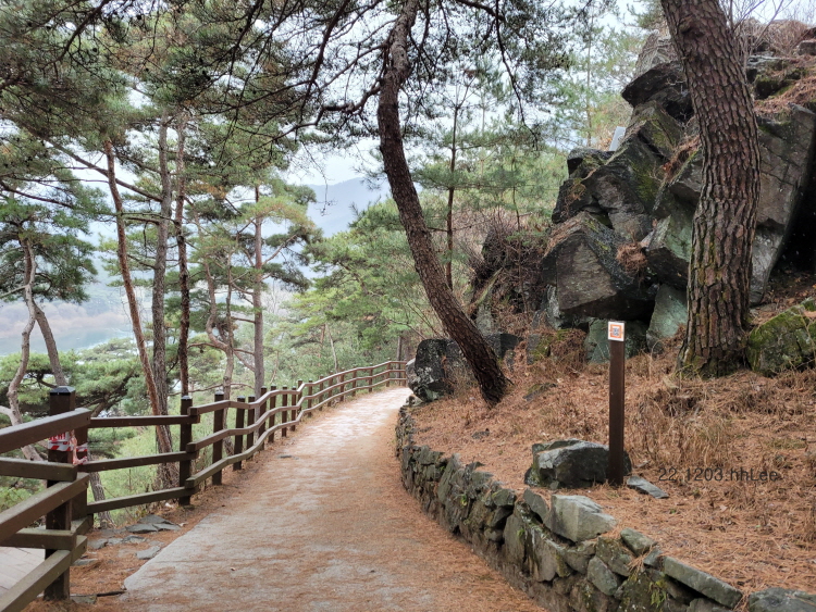 처음에 평지의 소나무숲길에서 시작하는데 바닥에 깔린 솔잎들이 인상적이다. 조금 더 들어가면 계단길이지만 목도나 숲길이 깔끔하게 조성되어 있어 걷는 내내 편안하다.