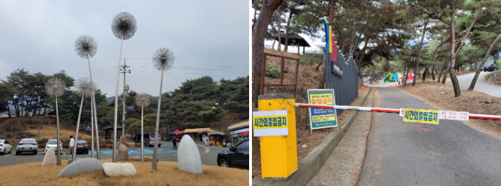 왼쪽의 민들에 홀씨 같은 조형물은 아래쪽 주차장에 있는 '산막이 옛길 예술로(路)_소풍가는 길'이란 제목의 괴산군 공공미술 프로젝트의 일환이다. 오른쪽은 특이하게 산막이 옛길 입구에 설치한 차단기인데 '시간외 출입금지'라고 적혀 있다. 물가라서 그런가?