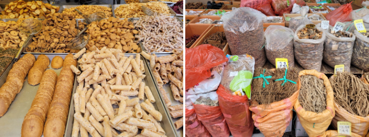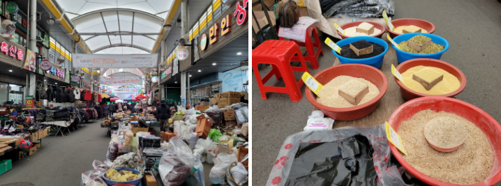 괴산 '산막이 시장'과 '괴산전통시장'은 도로를 사이에 두고 양쪽에 있다. 굳이 이름을 따로 쓸 필요가 있는지 모르지만 산막이 시장은 정비가 잘 되었지만 물건이 뻔한 느낌이었고, '전통시장'은 좌판 위주이면서 현지에서 생산되는 농산물이나 약재 등이 많았다.