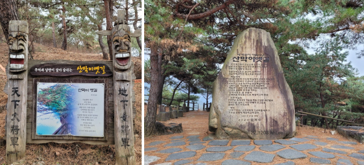 <산막이 옛길 등산로 입구와 아래의 노루샘>