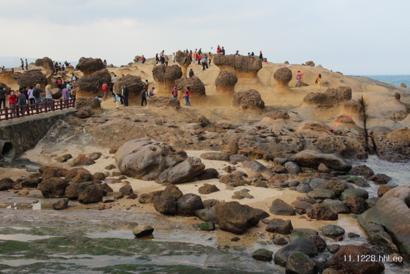 나는 이곳만 보는데도 시간이 모자랐다. 이곳엔 촛대(일명 유방)바위, 생강바위를 비롯하여 화석, 해식구 등이 있고 특히 버섯모양의 바위가 밀집된 곳이다. 아래 사진의 바위들은 미래의 '여왕머리바위'들이다. 정말 앙징맞지 않은가! 한편으로는 지금처럼 관리하면 날마다 깎이고 또 깎이는 바위가 얼마나 오래 갈까? 하는 노파심이 들었다. 인원 제한을 하던지 아니면 구역을 잘라 보여주던지 해야할 것 같은 생각이... 어쨌거나 다른 명소, 혹은 나라처럼 잔소리를 하거나 관여하는 사람이 아무도 없어서 편하긴 했다.